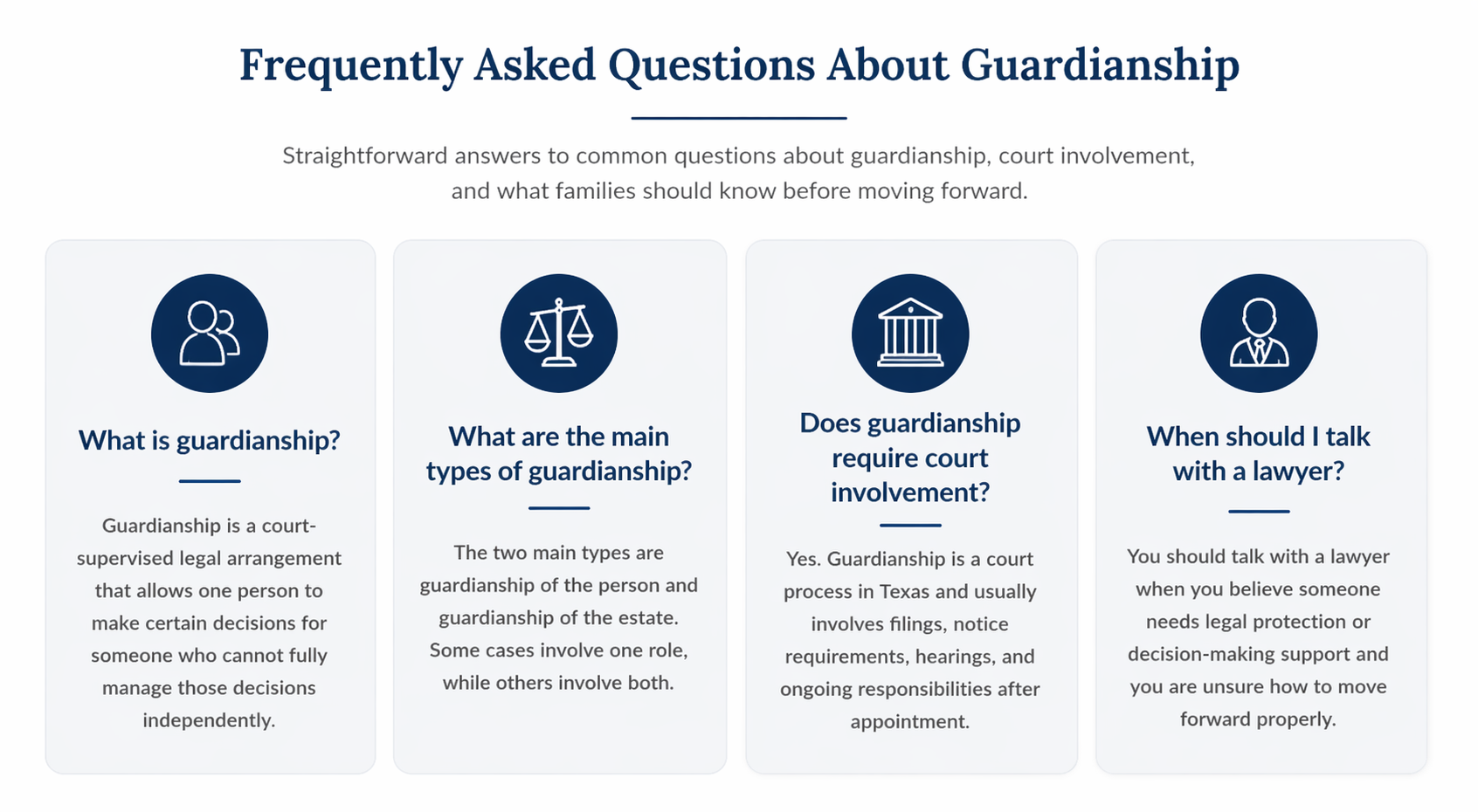 Because guardianship affects fundamental rights, Texas courts require formal filings, supporting evidence, and judicial oversight before granting authority. Families often need clear guidance to understand what the court expects and how to move forward appropriately.